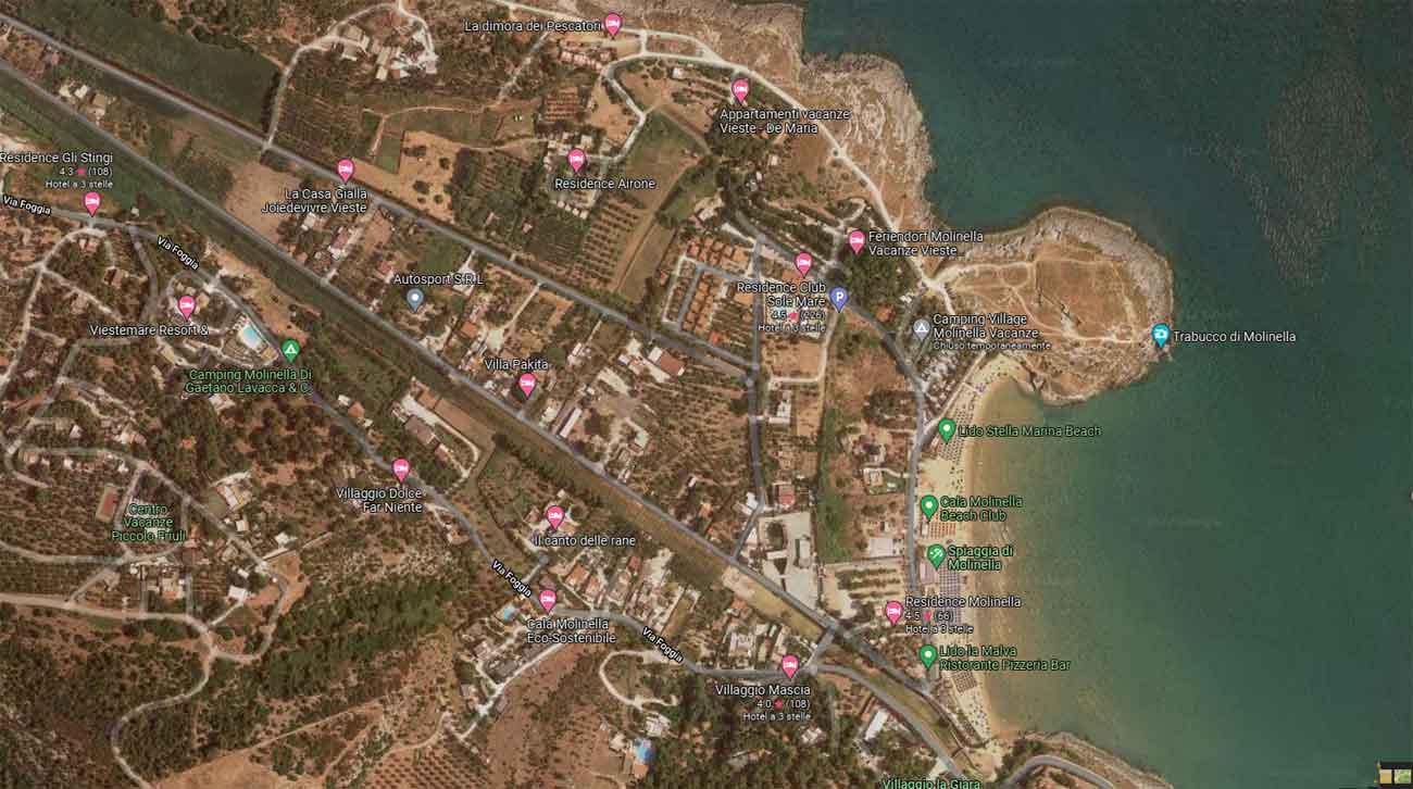 Costeggiando la costa, superata la spiaggia di San Lorenzo e quelle della Defensola, la spiaggia di Braico e spiaggia di Punta Lunga, da Vieste si arriva a Cala Molinella che è una delle baie più belle e suggestive insenature di Vieste con un Trabucco ancora in attività e da qualche anno rimesso a nuovo.